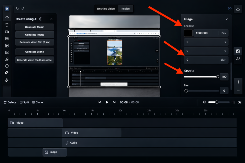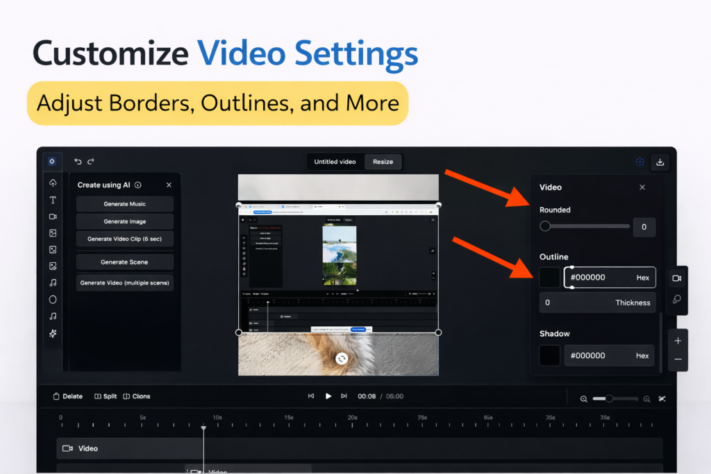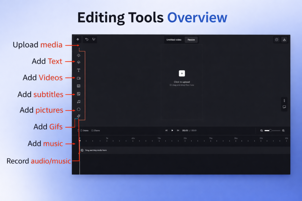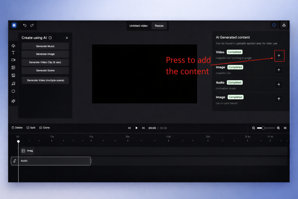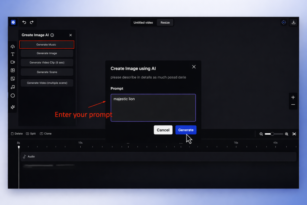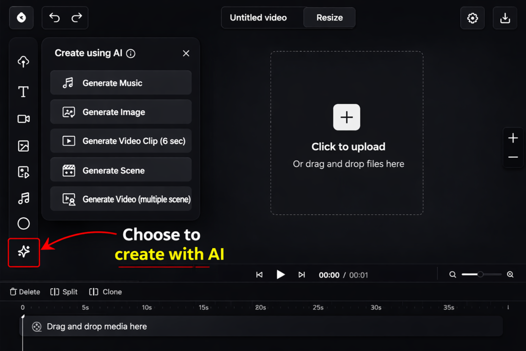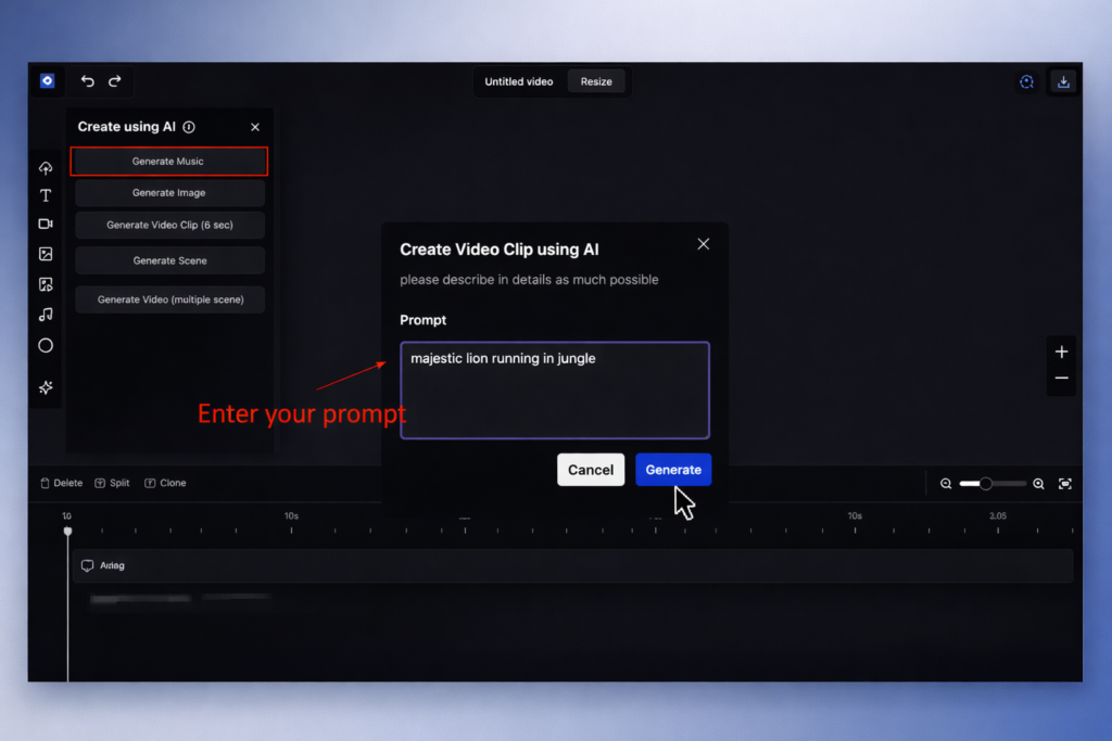 The platform combines AI video generation with a real timeline editor, screen recording, and full video production features inside a single workspace. This allows creators to generate AI video clips, place them on a timeline, trim or merge scenes, and organize the final video exactly as they prefer.