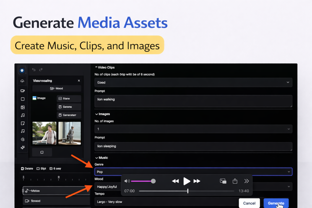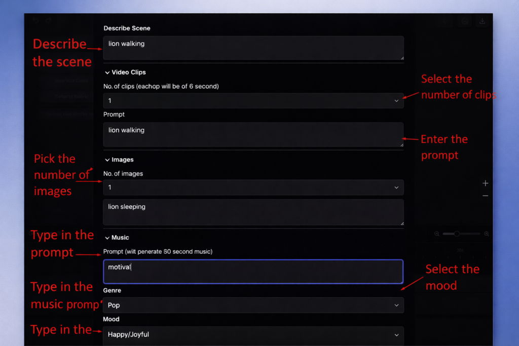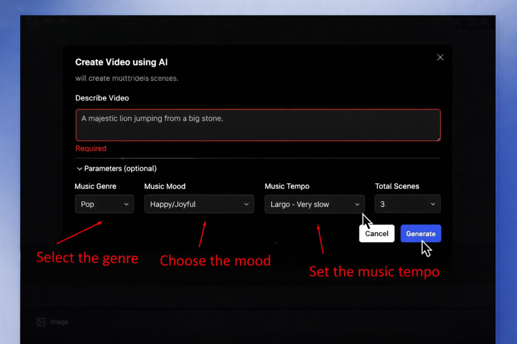 Generate a complete multi-scene video from a single description. Users can customize settings such as audio genre, mood, tempo, and the total number of scenes.