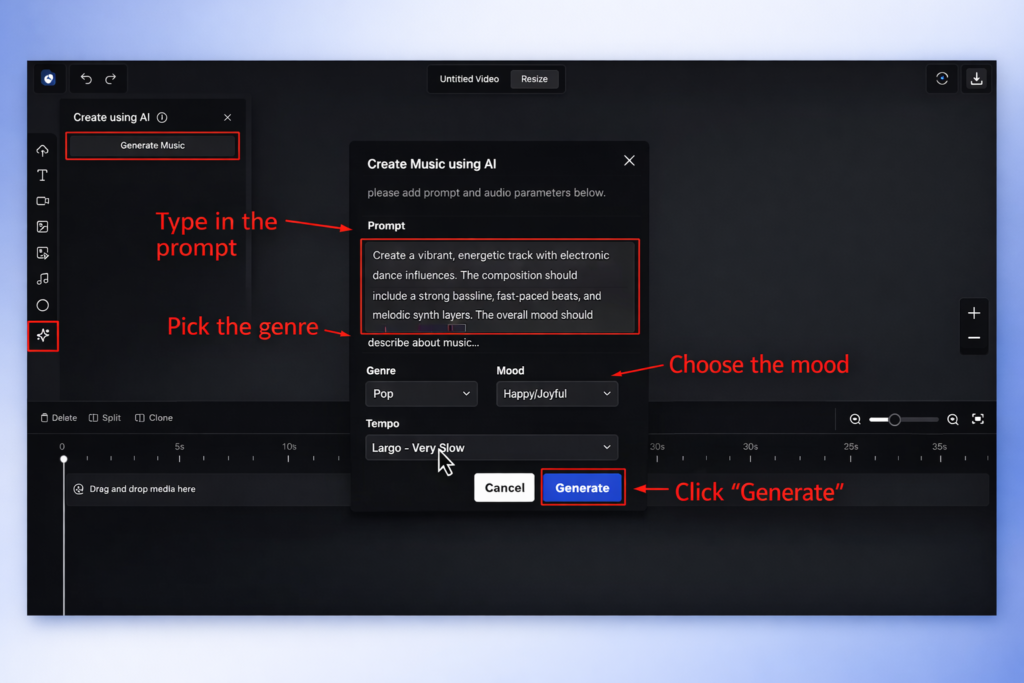 Create custom background music by selecting prompts, music genres, mood styles, and tempo settings.