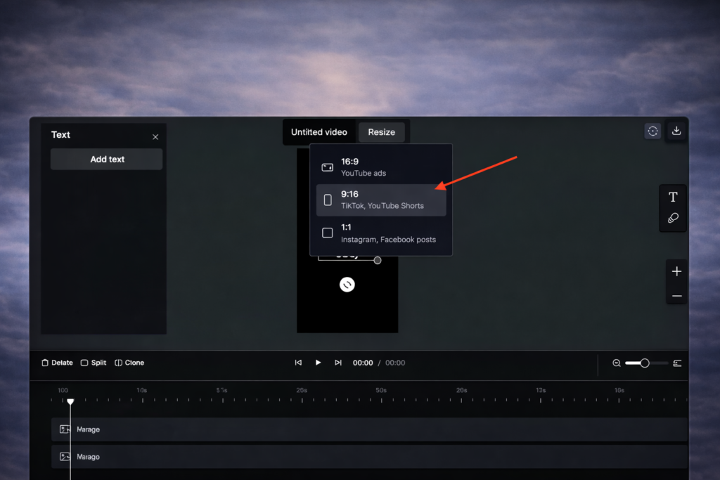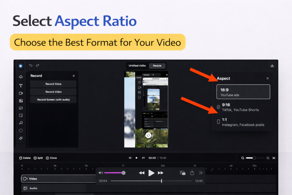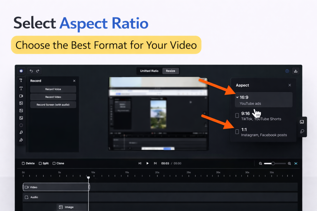 Resize videos easily to match popular formats such as 16:9 for YouTube ads, 9:16 for TikTok or Shorts, and 1:1 for Instagram or Facebook posts.