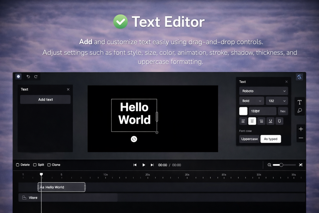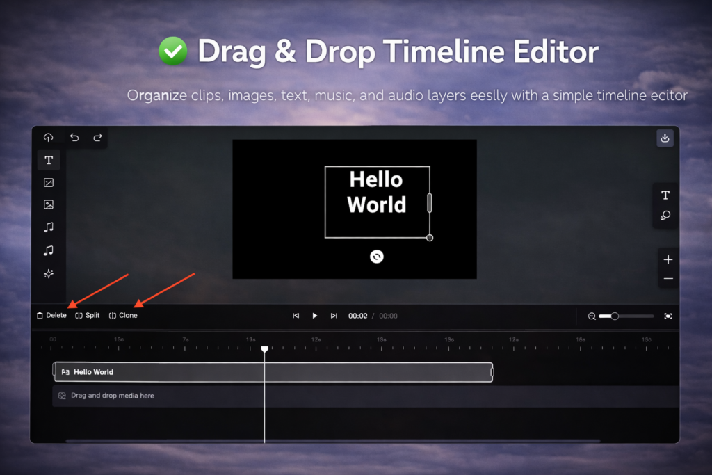Organize clips, images, text, music, and audio layers easily with a simple timeline editor. You can quickly delete, split, duplicate, or rearrange elements as needed.