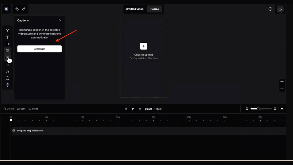Automatically convert spoken audio into captions, with the option to edit them directly within the editor.
