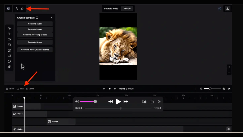 Use essential editing options such as undo, redo, deleting clips, splitting elements, duplicating layers, and locking the screen while editing.