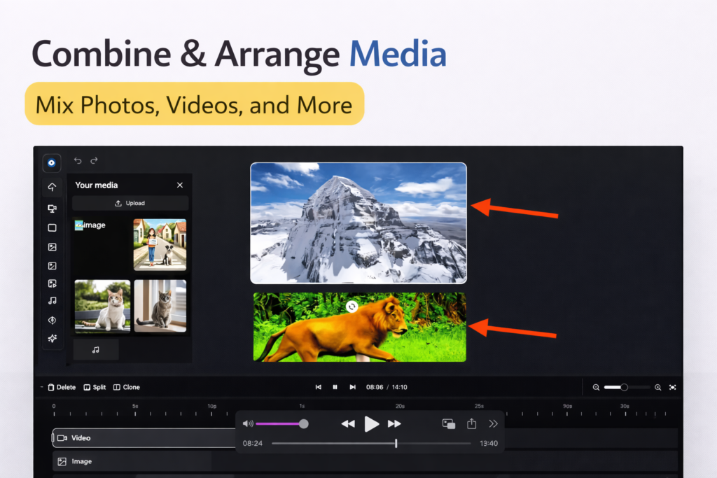 Yes. The platform lets you trim, cut, merge, reorder, extend, and combine unlimited clips within the multi-layer timeline editor so you can shape the final video exactly the way you want.